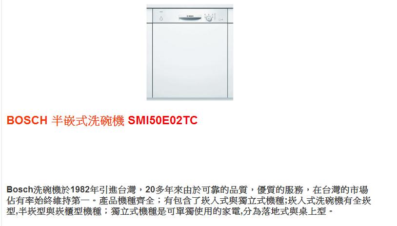 經過我解說價格與為何購買【限時活動優惠】!!詢價再優惠!! BOSCH 半嵌式洗碗機 SMI50E02TC-購買折扣中後婆婆竟然高興的說他的寶貝兒子真是幫他娶了
